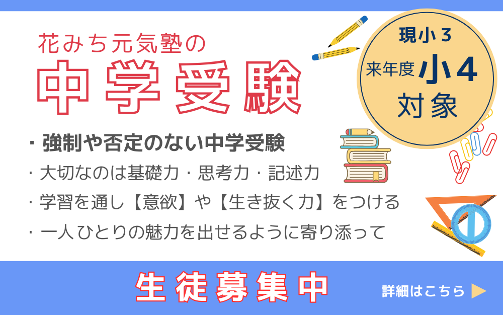志望校合格をめざすことはもちろん、中学入学後生き生きと生活し、更に力を発揮することを目標にしています。 詰め込みのみの成績アップをせず、ひとりひとりに合った対応をすることで学習に必要な「見抜く力」(自分自身の力を知る・弱点克服のためにどうするか考えられる)「詰める力」(試行錯誤できる・わかったことを人に説明できる)「あそぶ力」(真剣さを楽しさと感じたり幅を持った生き方ができる)を養います。