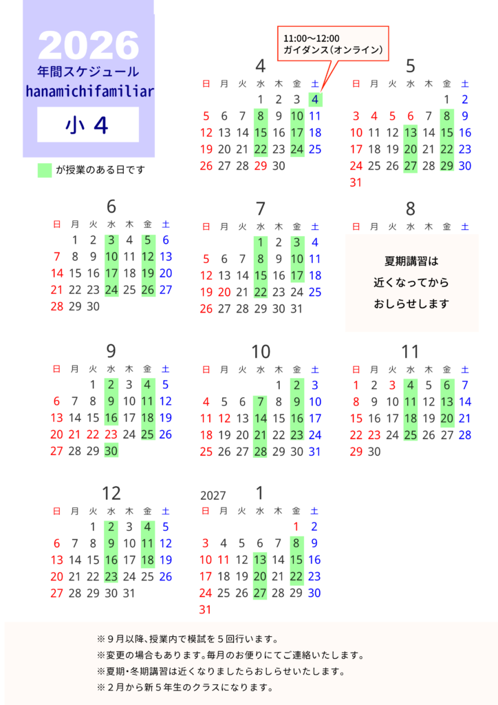 花みち元気塾年間スケジュール2025(小4)